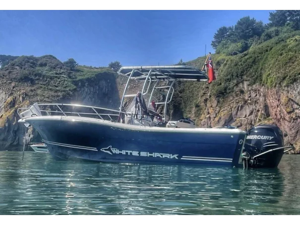 White Shark 226 for sale, built in 2016. Fitted with a 200 hp 4-stroke Mercury Verado outboard. Walk around with steering console and lockable forward facing hatch. She is fitted out with a leaning post/seating for pilot and co-pilot, T-Top, forward table, electric anchor windlass and full cushion seating. The front deck transforms into a sunbed, or dining space for the family with a cockpit table. Adaptable for many uses such as fishing, water sports and coastal or river exploration. The layout provides maximum space for ease of movement around the boat with a wide deep cockpit, central console plus plenty of flexi seating up forward. She comes with a trailer that has had new axles bearings and breaks.