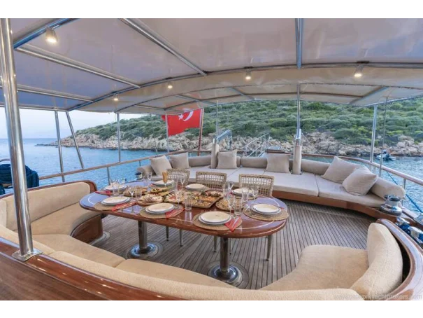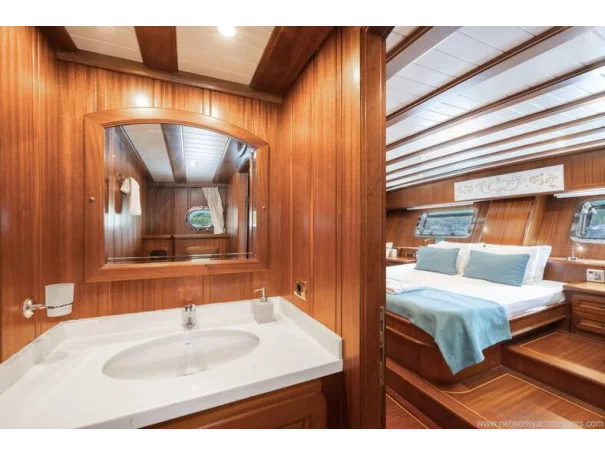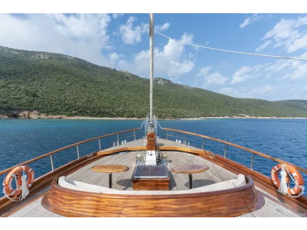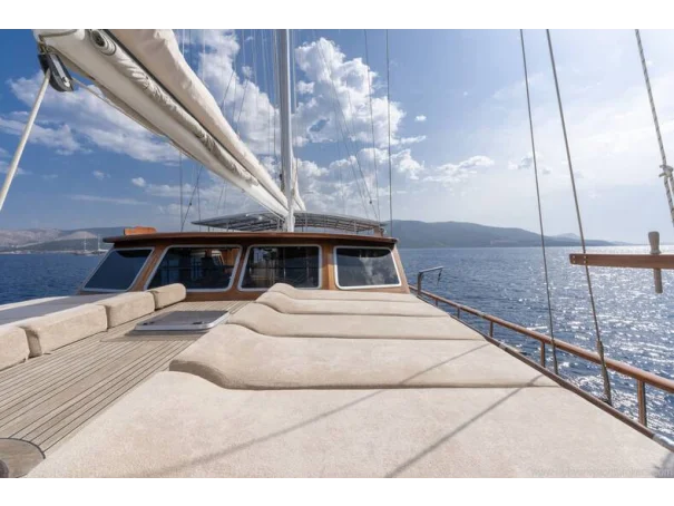 Powered by twin 450 HP Iveco engines, this gulet offers reliable cruising performance with an 11-knot cruising speed and a top speed of 12.5 knots. She is equipped with shaft drive propulsion, dual 33 kW generators and Simrad navigational systems. The vessel carries 6,000 litres of fuel, supported by two 220 L/h watermakers for extended autonomy. Traditional ketch rig configuration and wheel steering provide excellent handling and balanced sailing performance. Engine room is well-insulated and arranged for ease of access and maintenance.