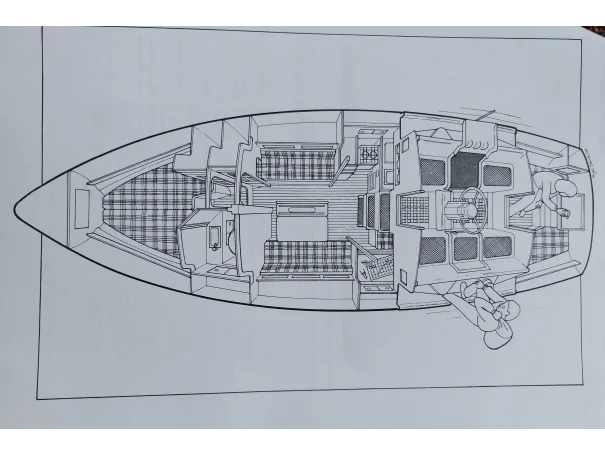 Includes manual marine toilet, oven, refrigerator, pressurised and manual water system with salt water inlet, and a central saloon table with bar.