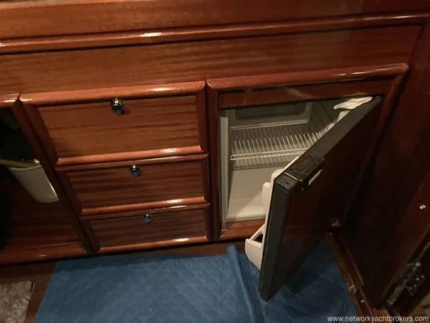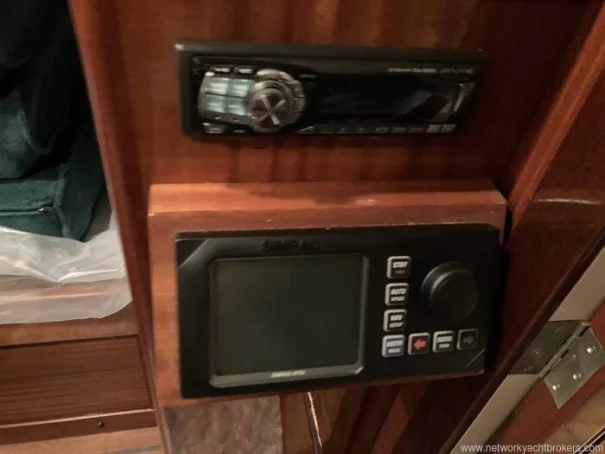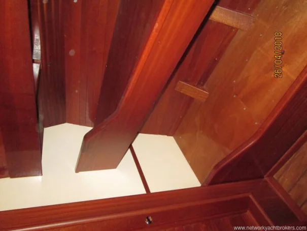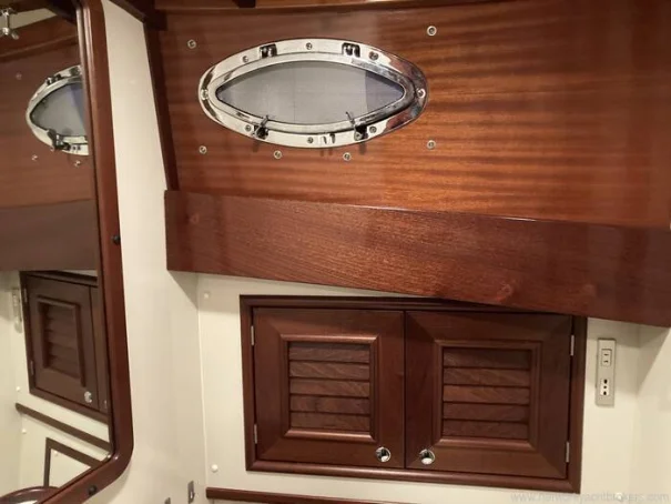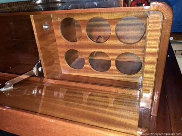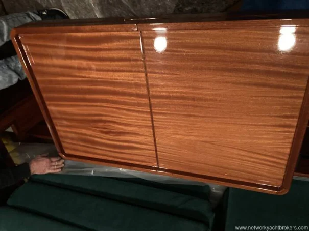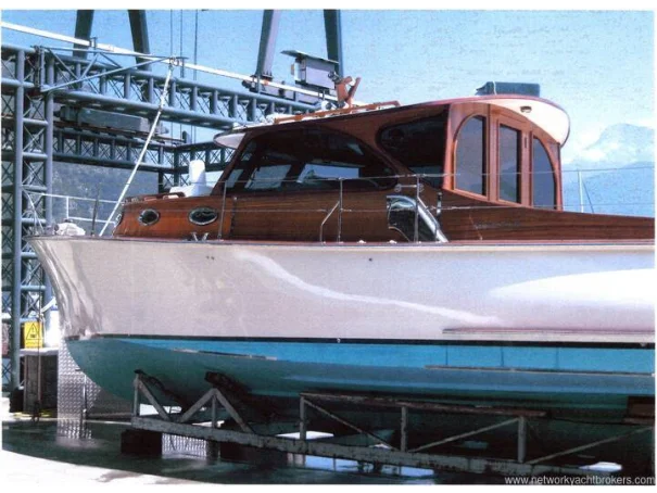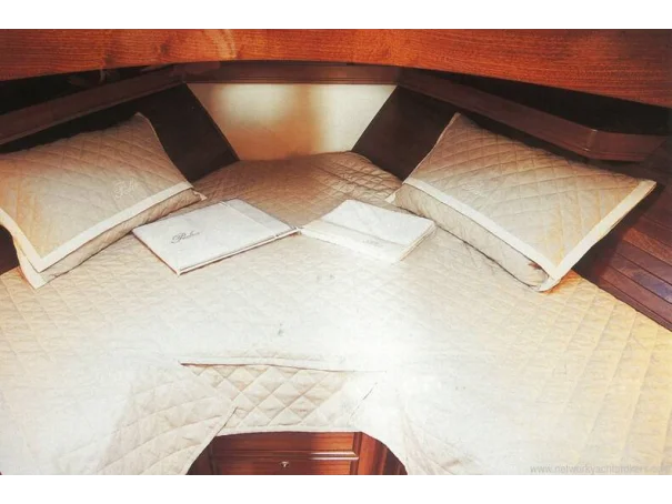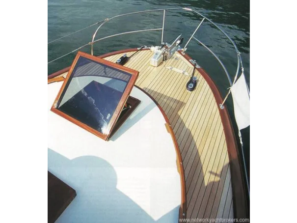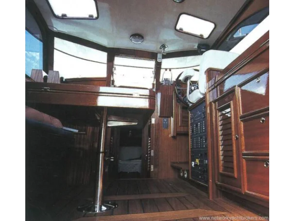 Built entirely in wood and based on the proven Rose Island 38’ hull, Pedro combines timeless elegance with outstanding seaworthiness. From keel to mast, there is not a single fiberglass component on board. Her construction features oak frames, triple-laminated mahogany planking, solid and plywood mahogany superstructures, and a beautifully laid teak deck. Exterior lines are defined by a classic transom stern, softly rounded aft topsides, and a distinctive forward deckhouse with oval portholes.