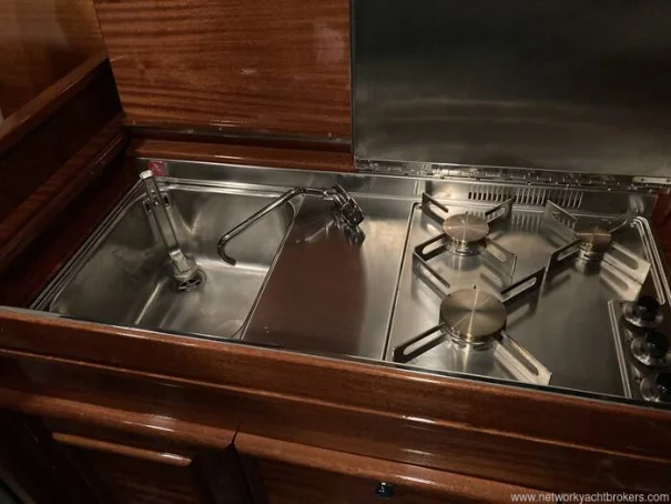 The interior offers an elegant and practical layout with a bright open-plan saloon, galley, and helm on the main deck. Below, accommodation includes a twin guest cabin, a bathroom with shower, and a forward owner’s cabin. All upholstery, fabrics, and linens were custom-made by Barani, with the yacht’s name hand-embroidered throughout.