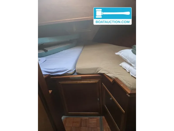 The sleeping accommodation consists of two fixed berths and two additional berths, making the ship suitable for a small family or guests. Mattresses are present, and the interior space is functionally arranged for both short stays and long-term living on board.