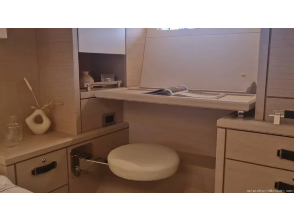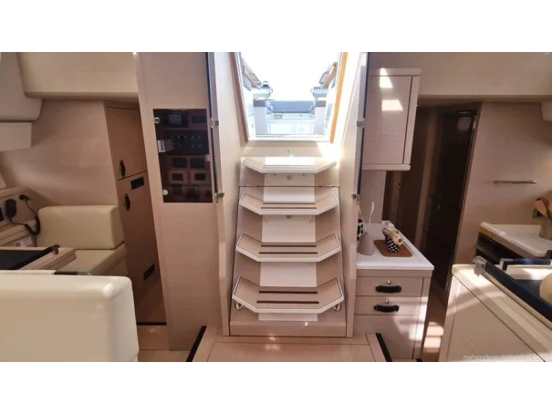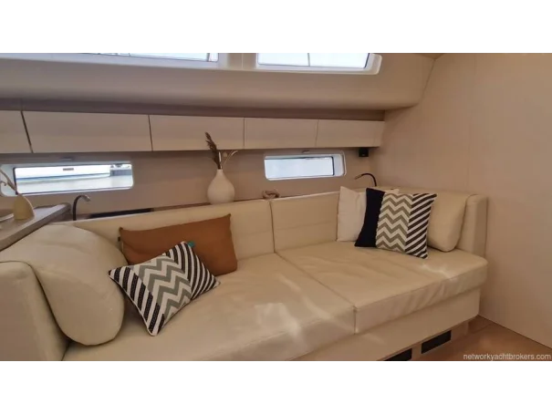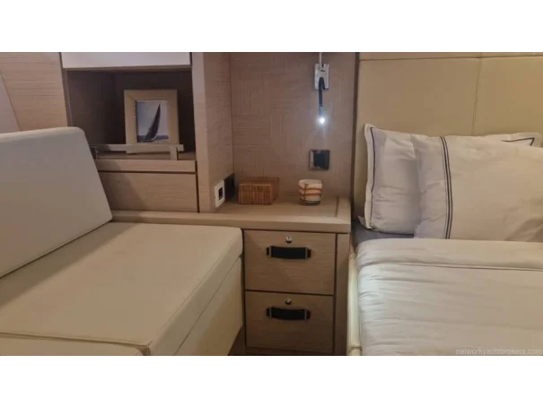The interior of this Jeanneau Yachts 65 features the sought-after aft owner’s cabin layout finished in Alpi® White Oak with “Ambiance Ivory” upholstery. The spacious owner’s suite aft offers a large double berth, bedside tables, a dedicated desk, sofa seating, and generous storage, complemented by an ensuite head with a separate shower. Two forward guest cabins provide comfortable berths and private heads, ensuring privacy for family or guests. The yacht also includes a fully equipped skipper cabin in the forepeak with two bunks and its own toilet and shower. The saloon is bright and inviting, with a folding Luxe table on an electric pedestal, two armchairs, and panoramic hull windows. The galley is fitted with Corian countertops, dishwasher, wine cabinet, microwave/grill, extractor fan, and large refrigeration units, making onboard dining a pleasure. Laundry facilities include a washing machine with dryer, while climate control is assured by a full air-conditioning system for all cabins and the skipper cabin. Every detail reflects Jeanneau’s commitment to luxury and practicality, creating a refined environment for extended cruising.