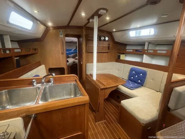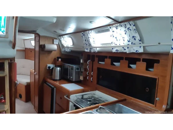 Below Deck; At the foot of the companionway lies a spacious galley area and main cabin, Forward of this, there is storage to port and the heads compartment opposite. Through a door lies the forward cabin with berths to both sides with an infill piece to make a double berth. A passage on the port side passes the galley leading to the spacious self-contained after cabin, with vanity unit and hanging locker. All the accommodation is lit by LED lighting.
