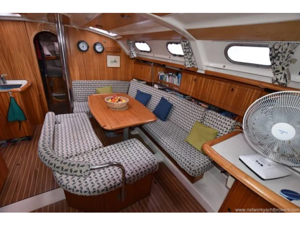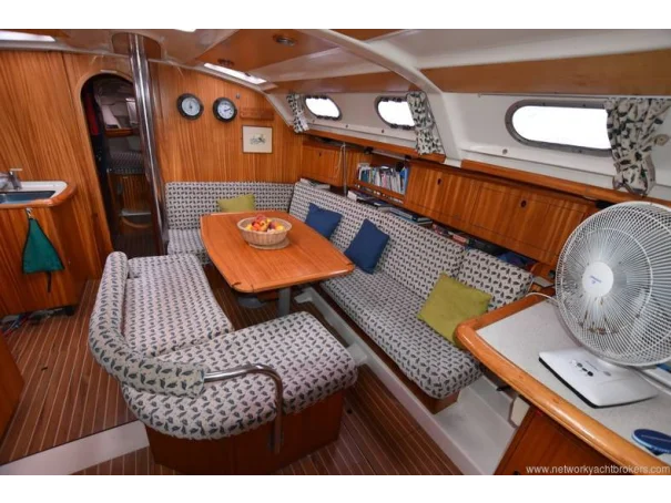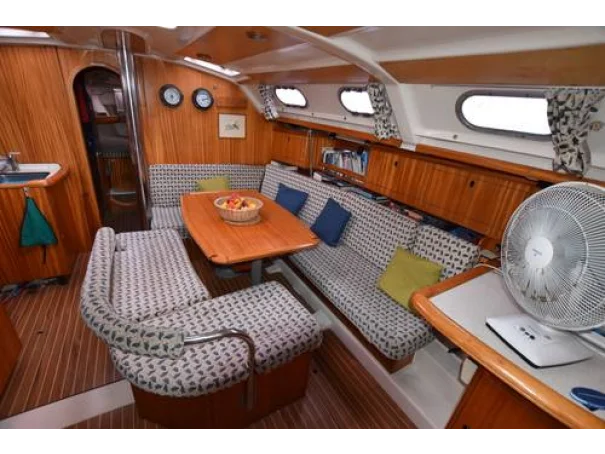 Settee to starbord Large table Stainless steel rail in settle with backrest cushions Converts into double berth Ample strorage