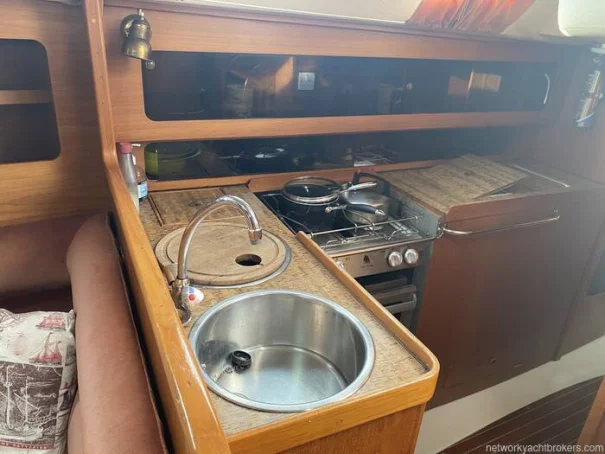 Opposite to starboard is the galley area with includes stainless steel sink with hot and cold pressurised water,
