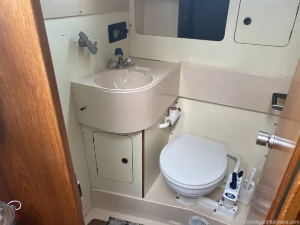 Aft of the chart table is the heads compartment with sea toilet and wash hand basin.