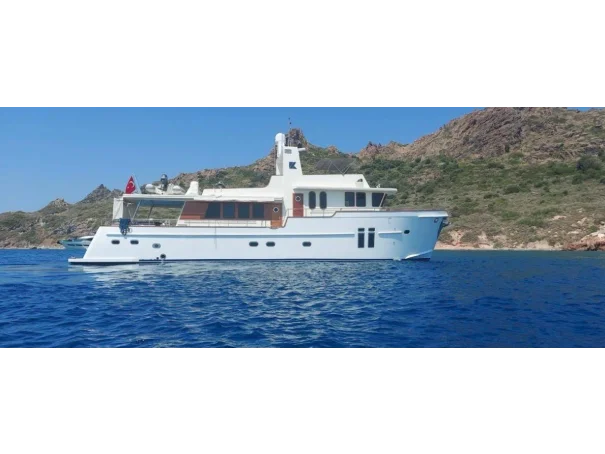 Custom-built 23.3m full displacement trawler designed for long-range cruising. Built in Bodrum with a laminated mahogany hull and designed by K. Erken. Accommodation includes a master cabin and two en-suite guest cabins, plus crew quarters. Powered by twin Caterpillar C12 engines with low engine hours, offering excellent fuel efficiency and a range of up to 1,600 NM. Major refit completed in 2025 including full exterior repaint, mechanical and electrical upgrades, solar panels and lithium batteries. Ready for immediate use.