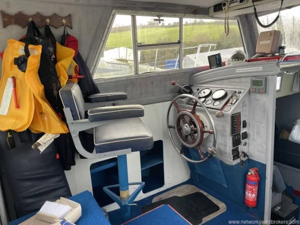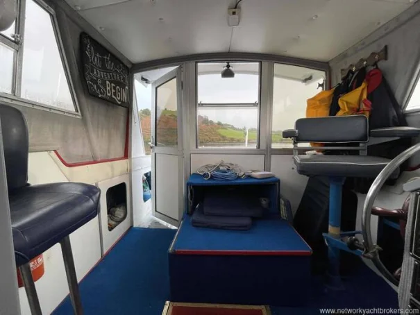 Roomy fully enclosed wheelhouse with opening side windows, helm seat to port and co-pilot seat to starboard.