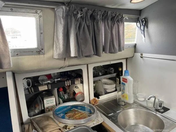 Going forward and down two steps brings you into the cabin with a galley to starboard complete with a stainless steel sink (pressurised hot and cold water), "Flavel" two burner gas cooker with grill and storage lockers.