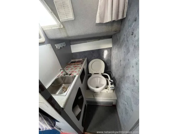 Heads in a separate compartment aft of the galley to starboard with a marine toilet and stainless steel sink with hot water via the engine.