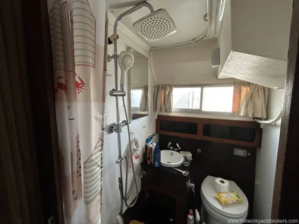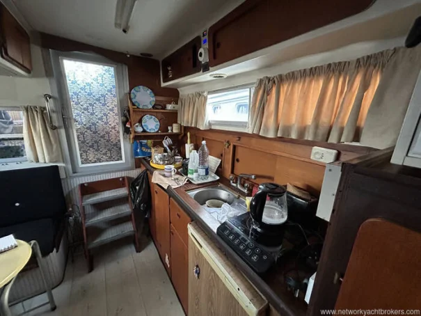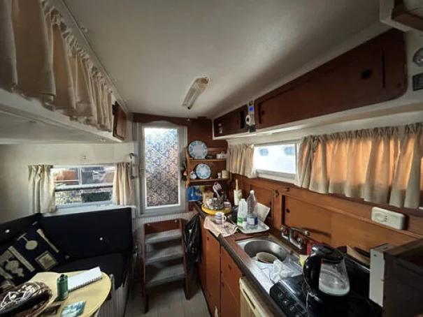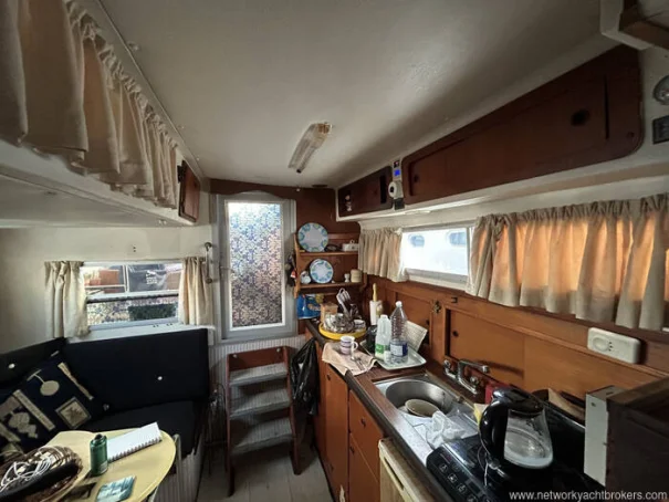 The galley is neatly positioned within the saloon area, allowing easy access while remaining sociable. It is well equipped for a boat of this era, featuring a 3-burner gas cooker with oven and grill, microwave, sink with pressurised hot and cold water, 12V fridge, and ample cupboard space for provisions. There is a Radio/CD Player fitted.