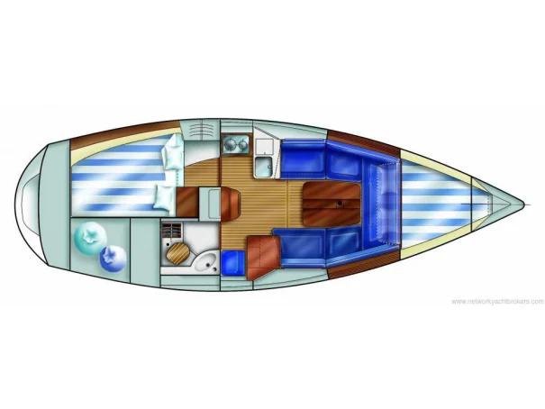 FORWARD (open plan), double berth with opening deck hatch, shelving and storage under the berth