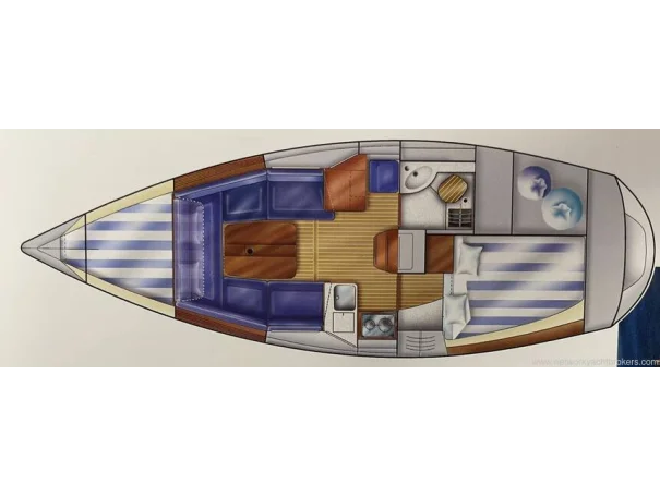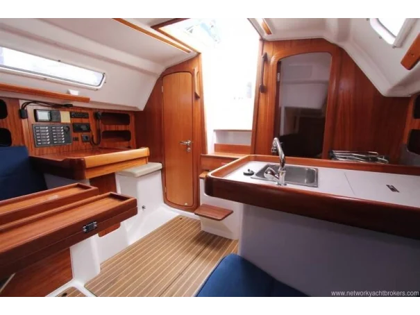 SALOON Two settee berths, saloon table with folding leaves, storage lockers, storage under the settees and opening deck hatch. GALLEY L-shaped is to port and comes with a two burner gas cooker and oven, stainless steel sink with cold pressurised water, 12V. fridge and storage lockers.