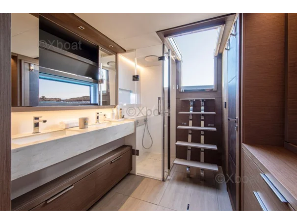 Its generous cockpit, accessible via wide skirts, offers smooth circulation and easy access to the aft platform, ideal for water sports. Designed by Nauta Design, its interior in Alpi wood is bathed in natural light thanks to the vast windows and skylights. The panoramic saloon offers a large living space, a dining table, and a bar, while the galley in the corridor allows for discretion and efficiency.