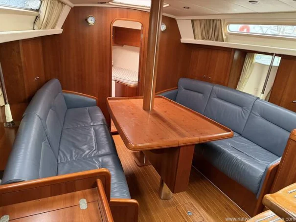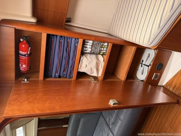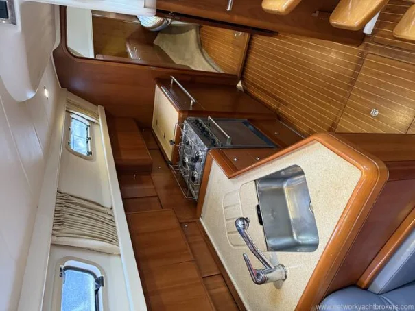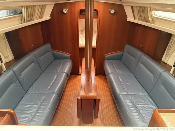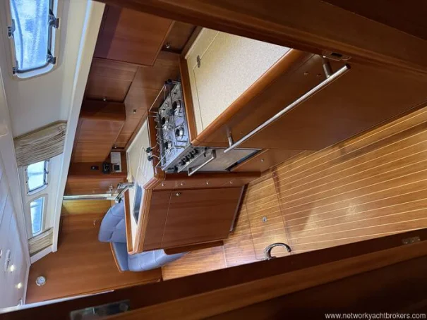 Below decks, the cherry joinery, blue leather upholstery, and teak & holly sole create a warm, high-quality interior atmosphere. The two-cabin layout offers a spacious aft owner’s cabin with island berth, a comfortable forward double, and a generous saloon, galley and proper chart table, making her equally suitable as a liveaboard or cruising yacht.