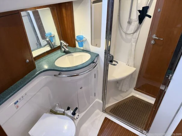 Heads aft of the chart table with saloon and aft cabin access