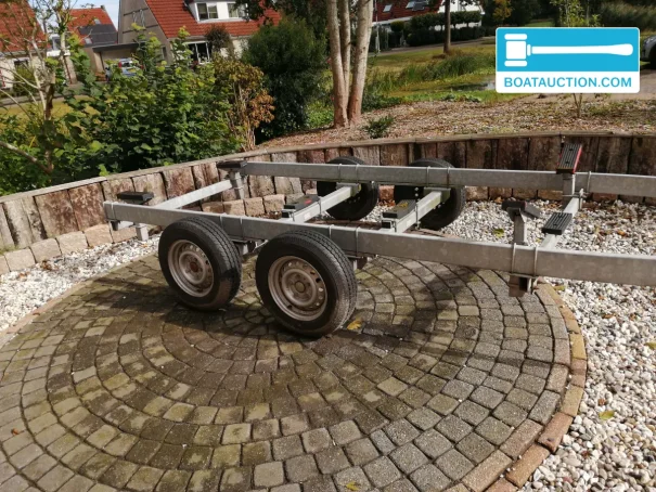 On deck, there is an anchor with chain and line attachment. For added safety, a manual bilge pump is available. Additionally, a custom-made galvanized storage trailer from the brand Sterk Trailers is included. This trailer measures 617 x 195 cm, has a load capacity of 2000 kg, and is equipped with two axles and wheels measuring 155 x 13 cm.