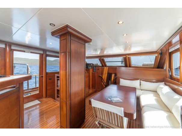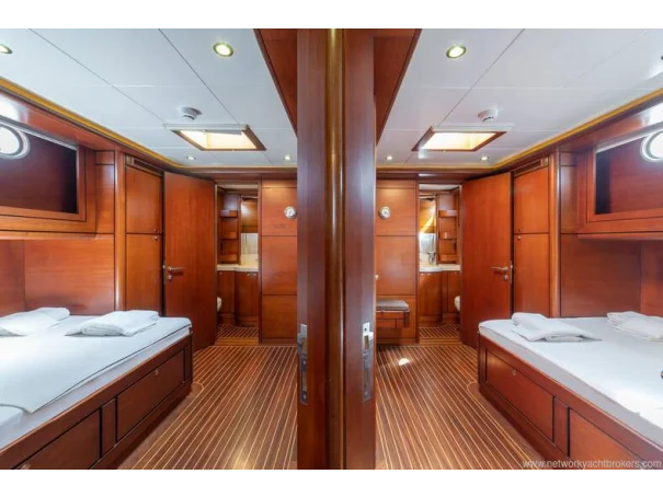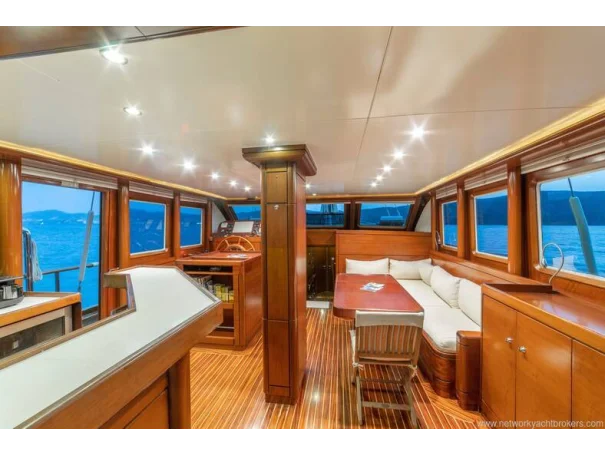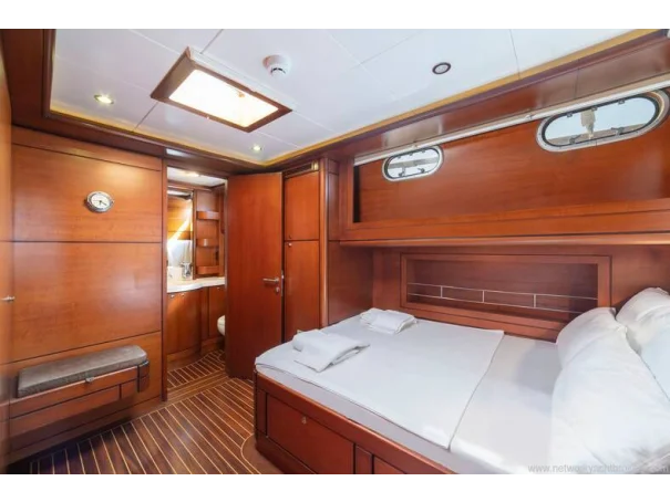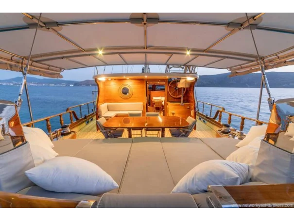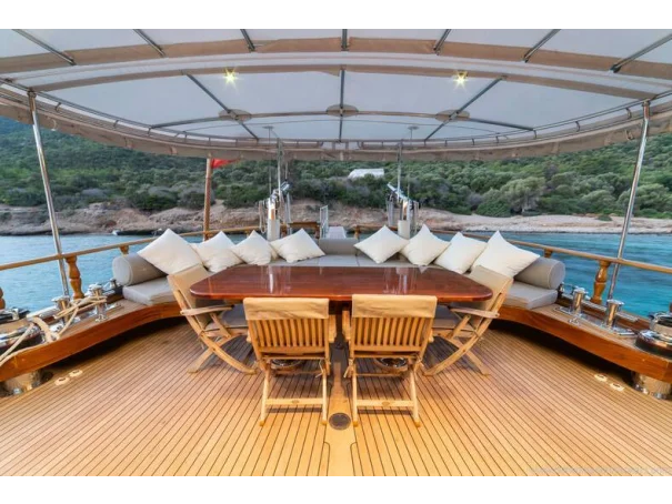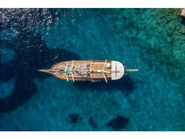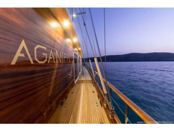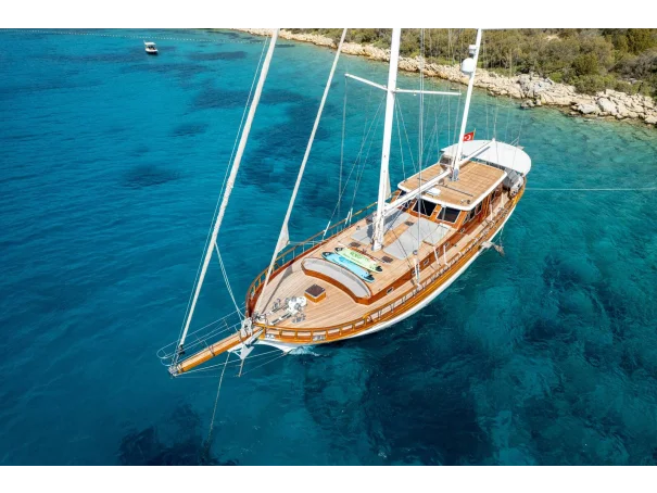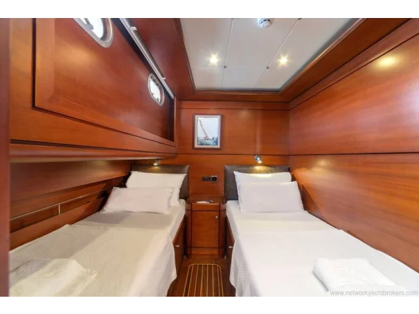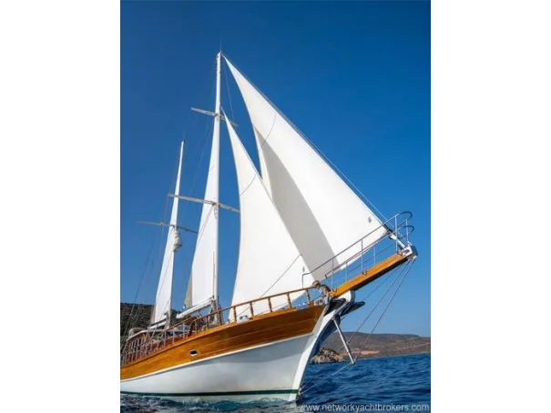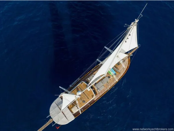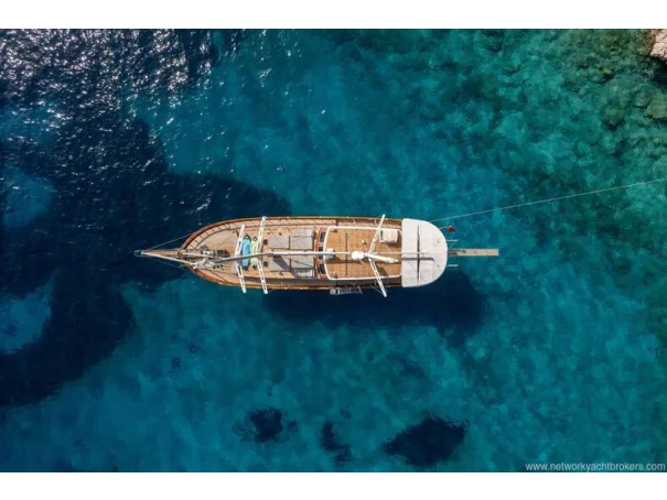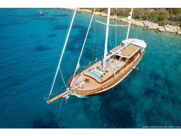 2009 Aganlar Yachts built 26.60m traditional Bodrum gulet. RINA C+HULL.MACH Y class. Cold moulded wood/epoxy construction. Private use only, never chartered. 4 cabins (2 double + 2 twin) for 8 guests plus crew capacity 3. Twin 265hp Volvo Penta engines with TwinDisc V-Drive gearboxes (2.5:1) and shaft drive. Twin 17.5kW Kohler generators. Condaria 72,000 BTU A/C. Side Power SP55HYD bow thruster. Victron inverter/charger. Fuel 3,500L stainless steel; water 3,500L; grey/dirty water 3,500L. Watermaker SR AquaWhisper 1700L/day. Simrad navigation. Lofrans windlass. Inventory :