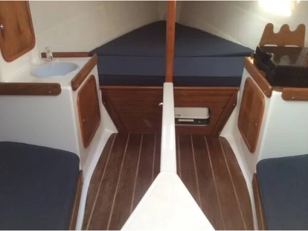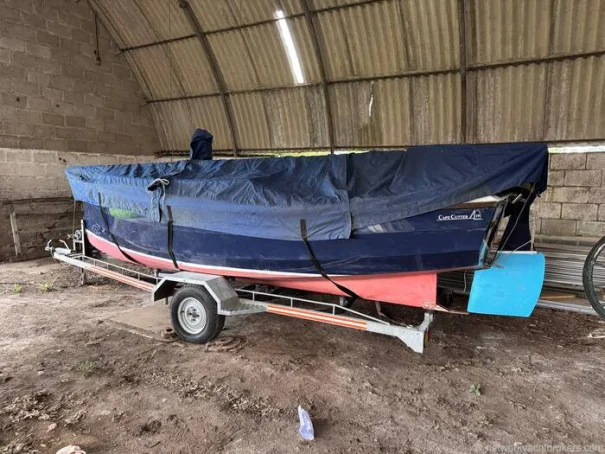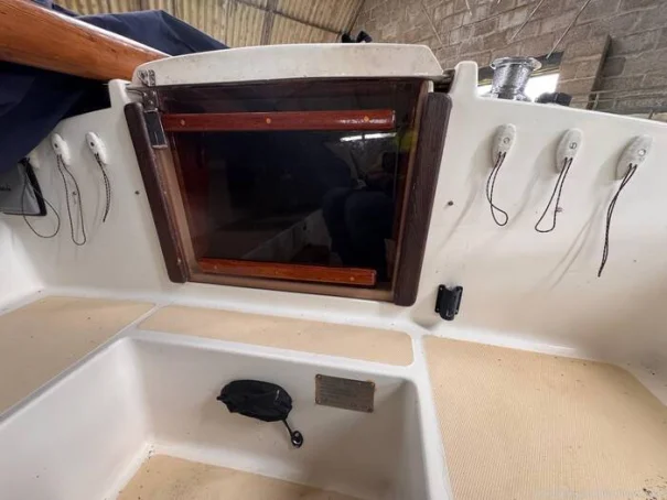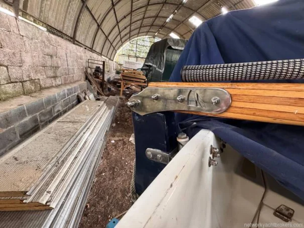 Currently in storage but available to view in Largs end March start of April. Accommodation : The accommodation offers four berths in an open plan layout. Upfront there is a small V-berth for two, with storage below and an opening hatch to the foredeck. Moving aft there is a galley unit to starboard with a portable gas burner and a locker above. Opposite to port there is a sink unit with manual cold-water supply. Further aft there are settee berths to port and starboard with stowage below and the centre plate between. The boat has an approximately 10 litre water tank and blue upholstery throughout. Inventory :