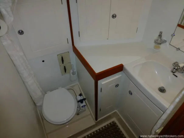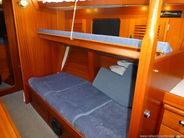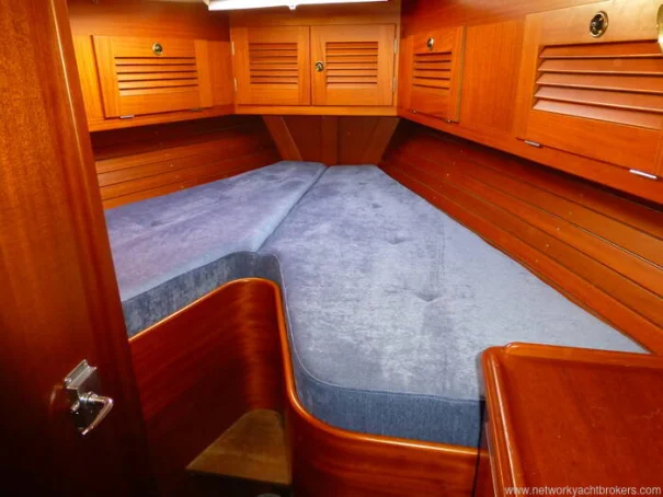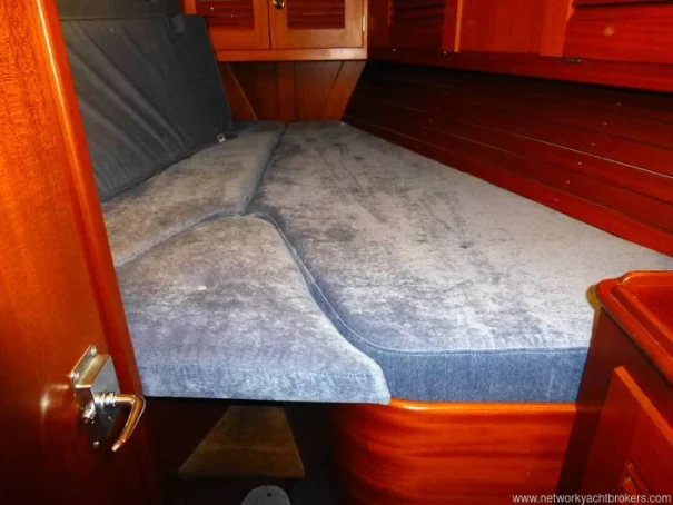 Aft cabin with double berth to starboard and single berth to port, lee cloths, seat, hanging locker to port, vanity shelf and mirror, opening roof hatch, two opening portlights and one aft fixed portlight.