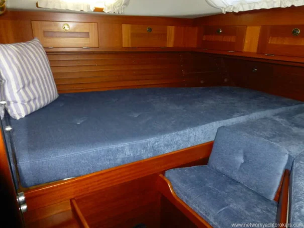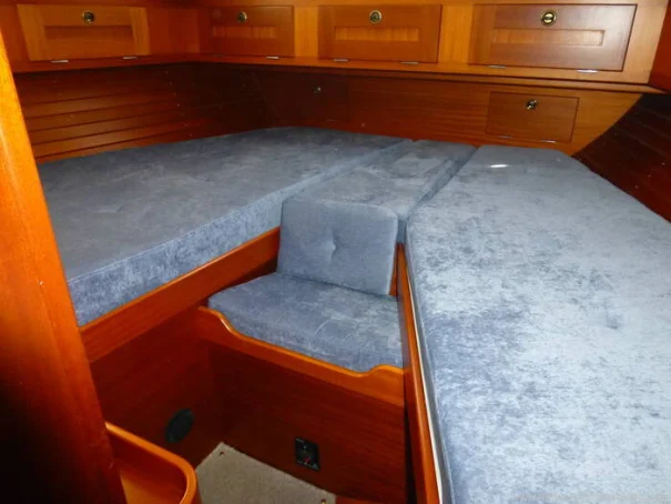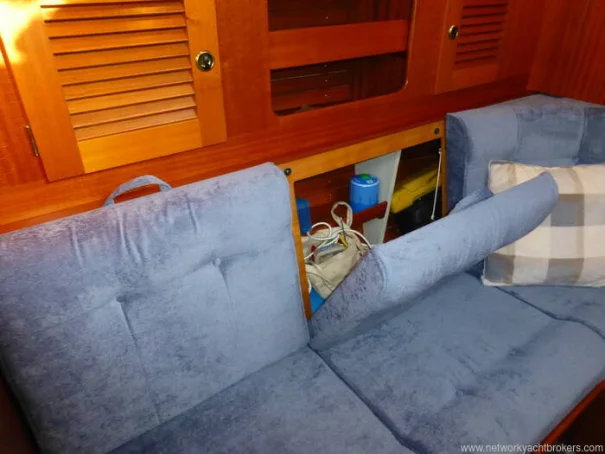 Privacy curtain leading through to the saloon with L shaped settee to port and bench settee to starboard, both can be used as single berths. Lee cloths fitted to both settees. Starboard settee seatback lifts to give a larger berth or provide extra storage behind. Port settee has storage behind seatbacks. Opening saloon roof hatch and fixed and opening portlights.