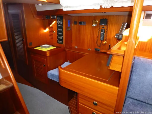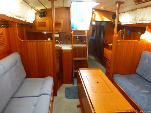 Central dining table with drop leaves and bottle storage. Galley to starboard and navigation station to port. Navigation station with seat with storage under and opening portlight.