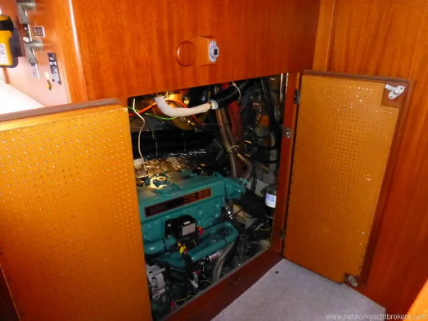 Aft of navigation station, walkthrough to aft cabin with doors to the engine room, locker and hanging locker off the walkthrough.