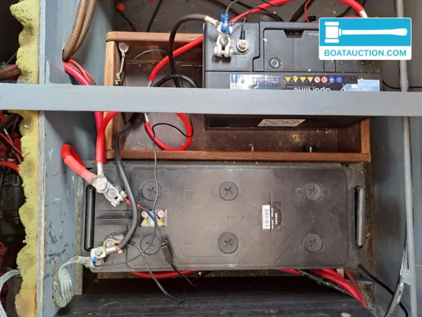 For sanitation, an electric toilet is installed. The toilet discharge goes directly overboard; in many cruising areas there are rules or restrictions regarding this, so it is advisable to check what is permitted locally and what modifications may be desirable. Electrically, the boat is equipped with shore power, a battery charger, alternator and voltmeter. There are two batteries on board with a total capacity of approx. 180 Ah at 12V, providing support for basic consumers during stays on board.