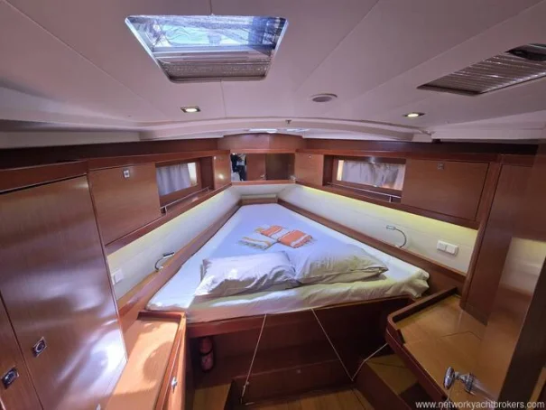 Forward is a spacious owner’s cabin with a generous double berth, ample stowage, and excellent natural light from deck hatches and portlights. The cabin offers hanging lockers and shelving to keep personal gear organized underway or at anchor.