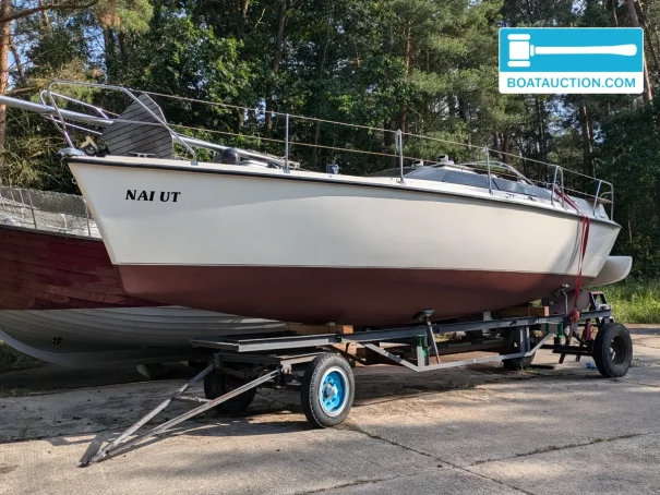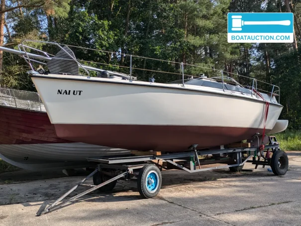 A storage trailer is included in the sale, which is useful for winter storage or moving the boat around the yard. The trailer is unbraked and in reasonable condition.