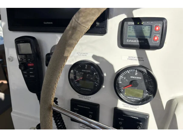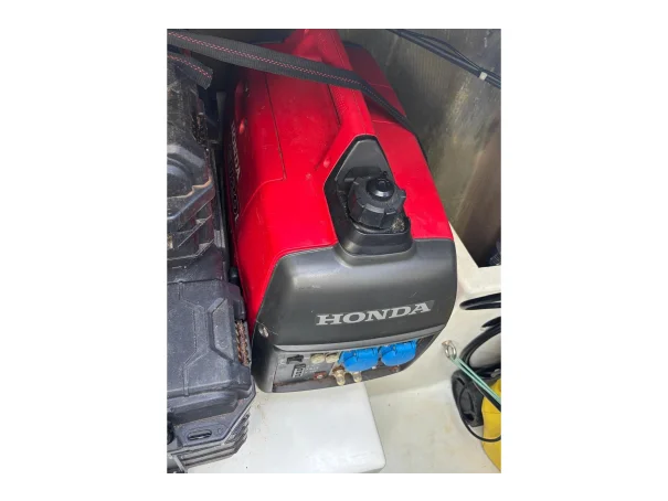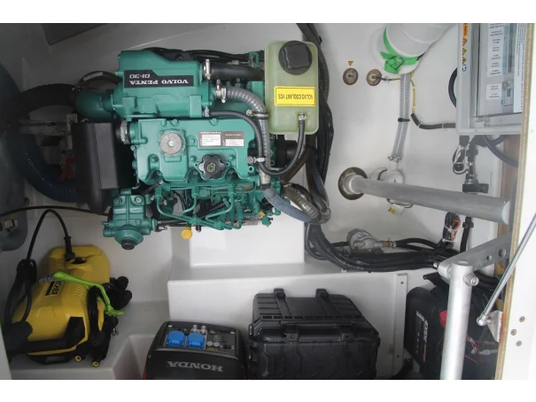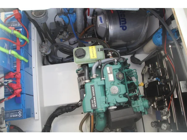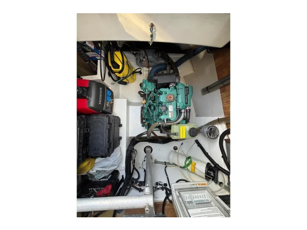She is powered by twin Volvo Penta D1-30F diesel engines with sail drives and folding three-blade bronze propellers, delivering a cruising speed of approximately 6 knots and a maximum speed of 7.5 knots. The engines have accumulated 1,267 hours and are supported by a well-specified electrical system, including 7 solar panels, a Victron inverter and charger, a portable Honda generator, and ample battery capacity, ensuring a high level of energy independence.