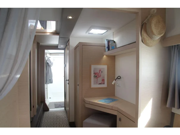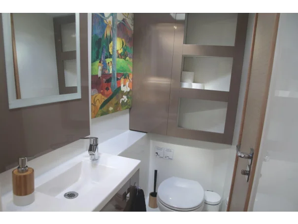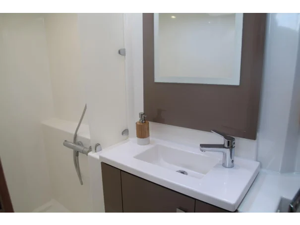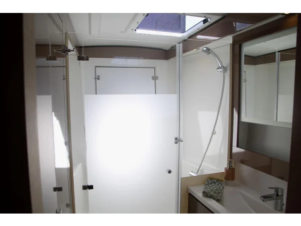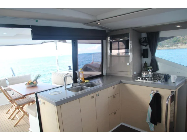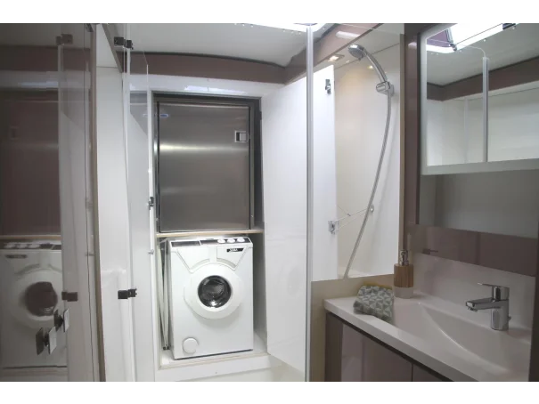 Accommodation comprises three double cabins and two full heads, providing comfortable sleeping arrangements for up to six guests. The interior is bright and practical, with a well-equipped galley featuring a gas cooker with three burners, oven and grill, two refrigerators, and a freezer with icebox. Additional onboard comforts include diesel cabin heating, a hot water system, a washing machine, and a TV. 2 sinks in the galley (with fresh and sea water).