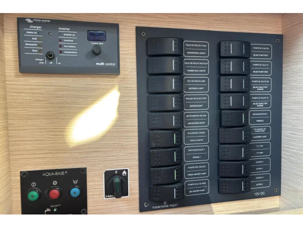 Water System: Pressurised, hose seawater at the bow to clean the anchor, Water maker – AQUA BASE ESW 60l/h, Heat exchanger located close to water maker, can be run with engine, batteries or shore power