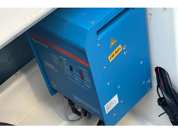 Equipped with a Victron Quattro 12/3000/120 inverter/charger and a substantial AGM service bank (6 × 110Ah), supported by approx. 700W of solar panels, providing strong autonomy for extended cruising.