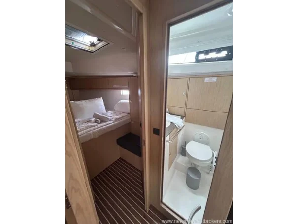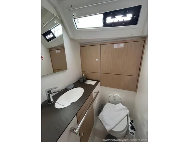 Forward cabin: shower on port side, one Jabsco manual WC on starboard
