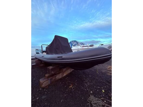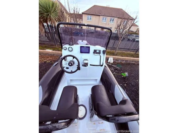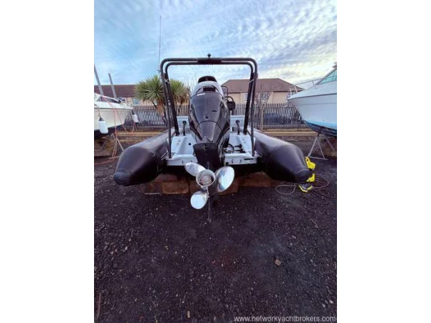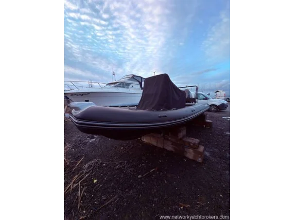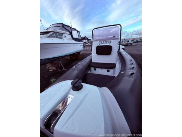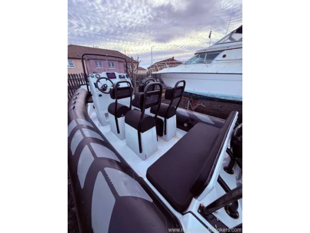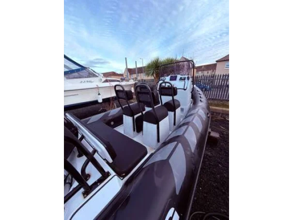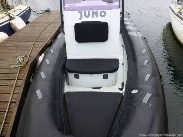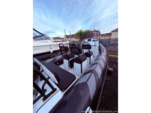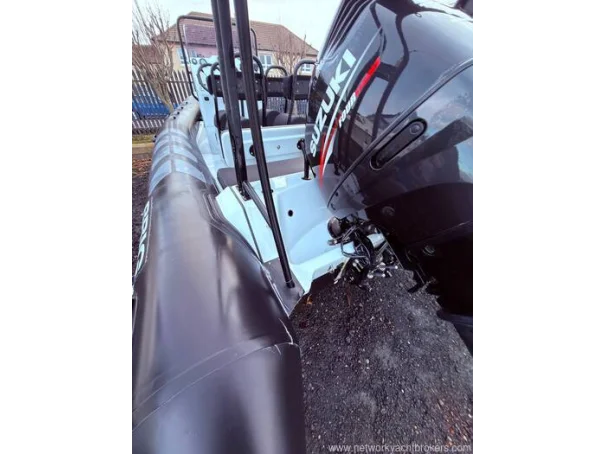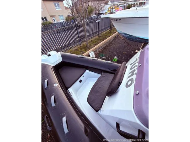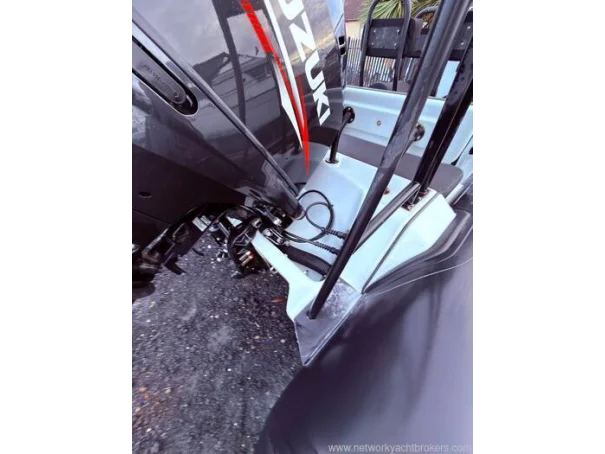 Light grey gel coat antifouled in black. Hypalon tubes, A-frame with towing eye for a wakeboard or skis and navigation lights. Self draining deck, automatic bilge pump, Ultraflex hydraulic steering, rear bench seat with locker underneath, helm seat with 3 additional Jockey seats, full console and seat cover by Saturn Sails, double width console with double seat forward and locker underneath, bow cushion over the anchor locker and triple bench seat over locker at stern.