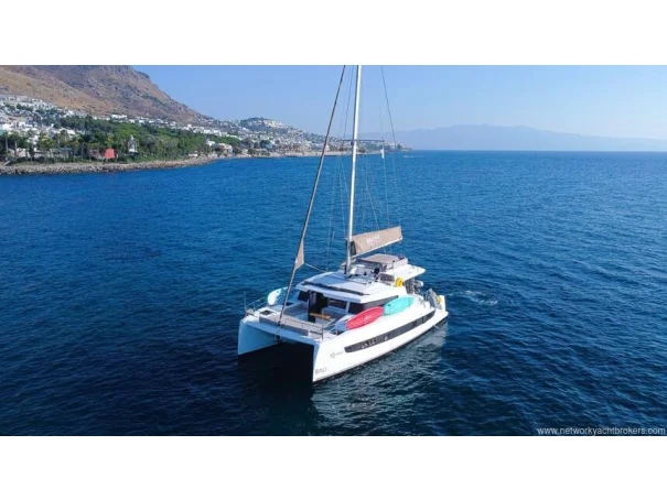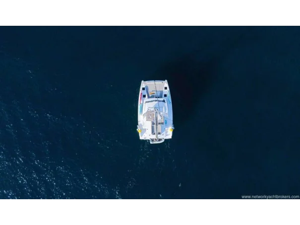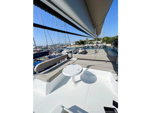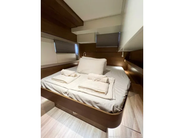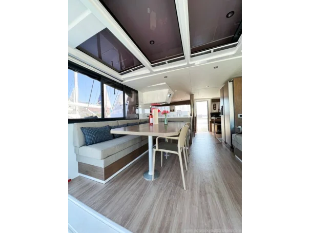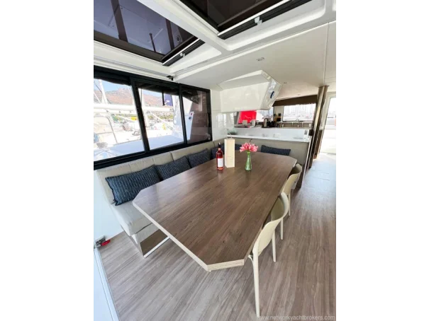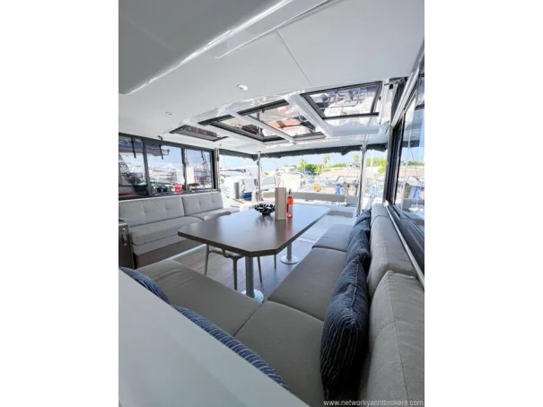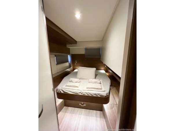 Equipment Air conditioning in each cabin 4 x 8,000 BTU Dometic units Kenyon Pro Mac 180 L watermaker (249 hours, March 2026) 12 V USB charging outlets in cabins Lalizas 10-person life raft Flybridge table and cushions Manual dinghy davit Mosquito screens and sunshades on hatches