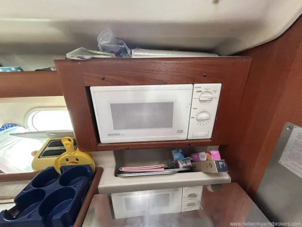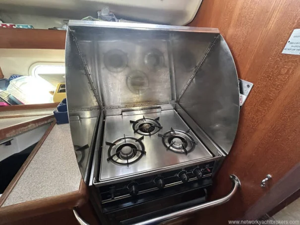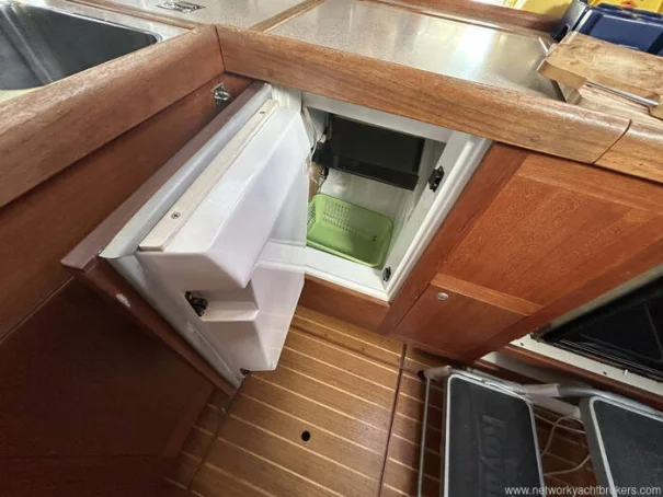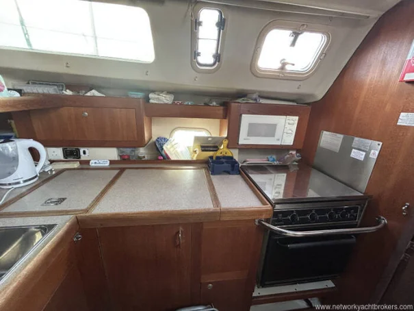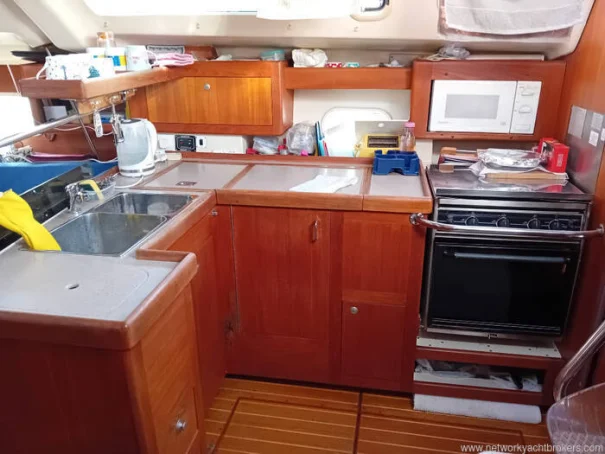The L-shaped galley is positioned to starboard aft of the saloon and is well equipped for extended cruising, featuring a gimballed 3-burner cooker with oven and grill, microwave,a front and top loading refrigerator with a 210-litre capacity , a freezer with a 120-litre capacity, twin stainless steel sinks and generous storage for provisions and cookware. The yacht carrys two gas cylinders.