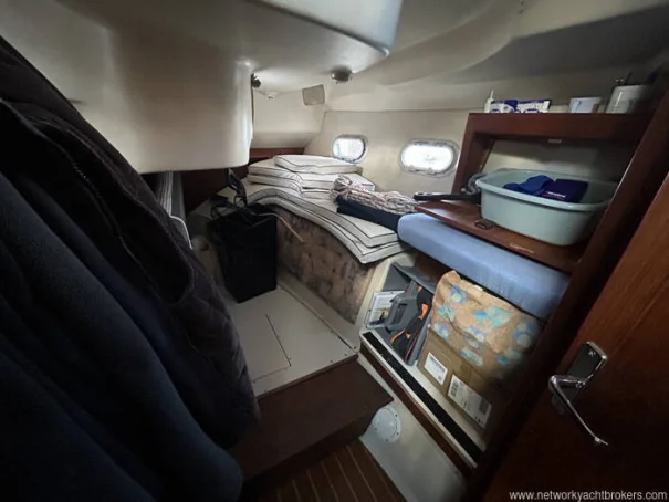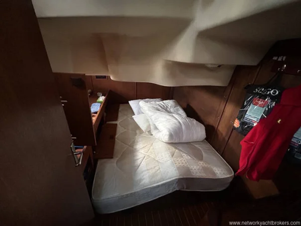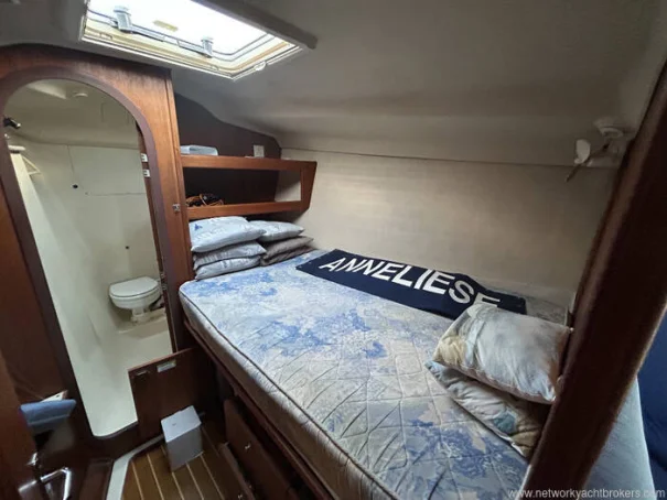 The owner’s forward cabin occupies the full beam of the yacht and offers a large offset double berth, hanging lockers, shelving and good headroom, providing a comfortable and private sleeping area.