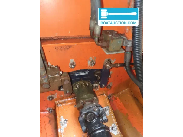 Furthermore, an electrically operated bilge pump is installed. An off-load release hook is no longer present, which may be relevant for buyers considering the vessel specifically for certain offshore or lifting applications. The anchor is present and rigged with a line; an anchor winch is not installed, which fits the no-nonsense character of this type of workboat.