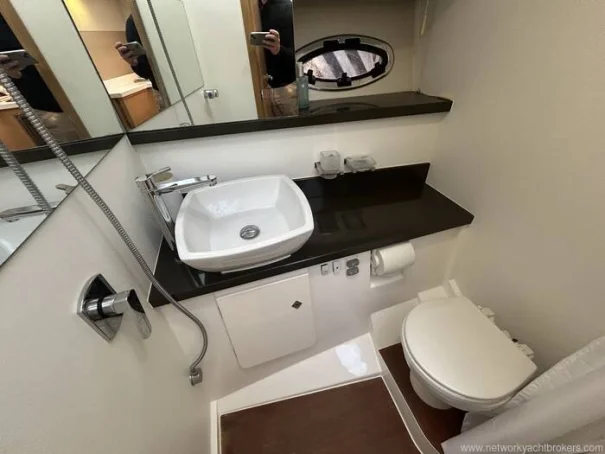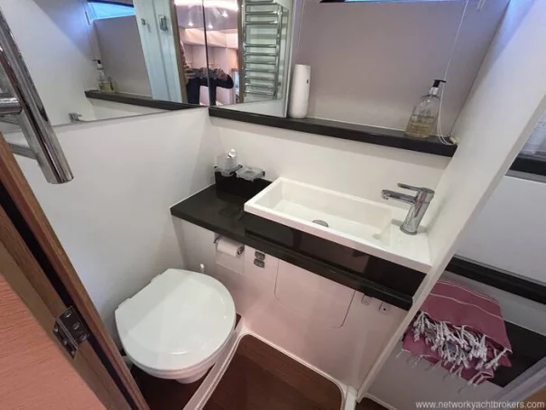 En-suite heads in aft cabin with electric flush toilet, sink and vanity unit and separate shower compartment.