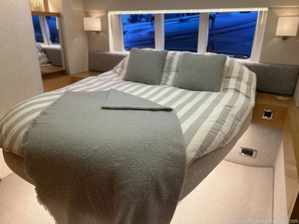 Aft owners cabin hosts a large central island berth with an upholstered bed head, panoramic window giving extensive views from the transom, fully recessed blinds, extensive wardrobe and locker space, mirrors, mixture of large storage cupboards, wardrobe and drawers.