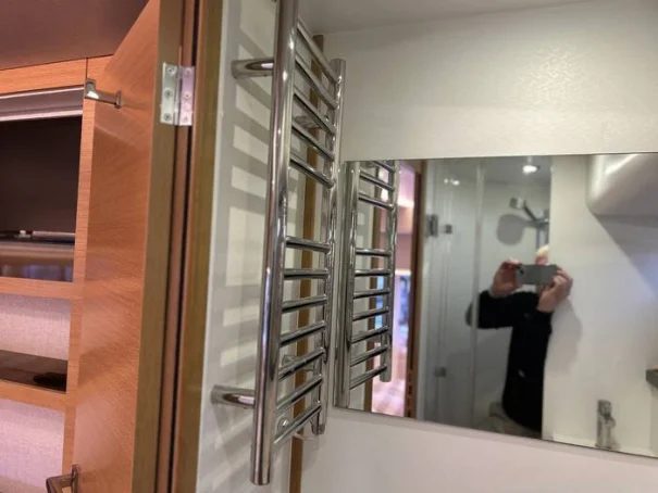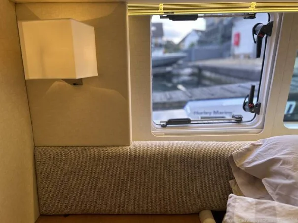 Forward guest cabin is in the upgraded double bed arrangement running parallel to the lines of the boat, upholstered surrounds and hull linings, storage under berths, two wardrobes, mirrors, roof hatch.