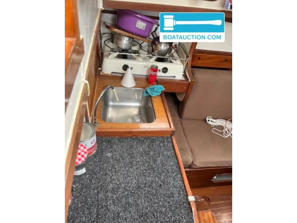 Inside, the boat offers practical accommodation with a dinette, cooking facilities and mattresses. The headroom of approximately 1.90 metres makes staying on board comfortable, especially for a yacht in this length class. There are five fixed berths, making her interesting for a (young) family or for those who like to head out with friends.