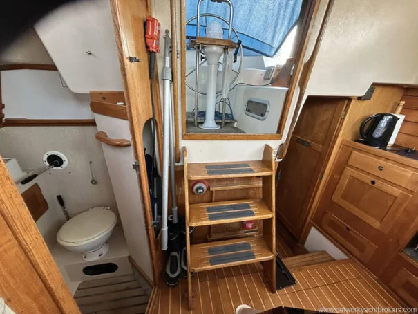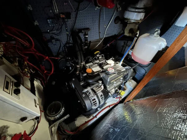 Located abaft the companion way is a Yanmar 3YM30AE fitted new in 2021, 29 HP diesel engine. The engine has completed 470 hours as of 30th March 2026. Freshwater cooled. Single lever controls at the external helm with electric start. Shaft drive to a fixed 3-bladed propeller. The shaft bearing was last changed in 2018. It has a 100 Litre stainless steel fuel tank. This yacht will cruise at 5.5 knots and has an approximate maximum speed of 6.5 knots. A SidePower through tunnel bowthruster was fitted in 2018.