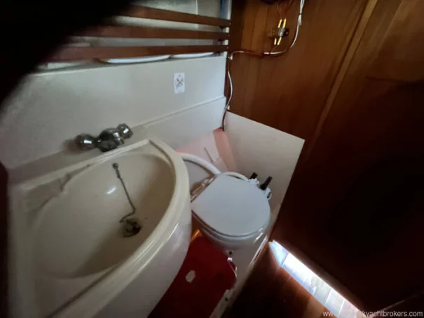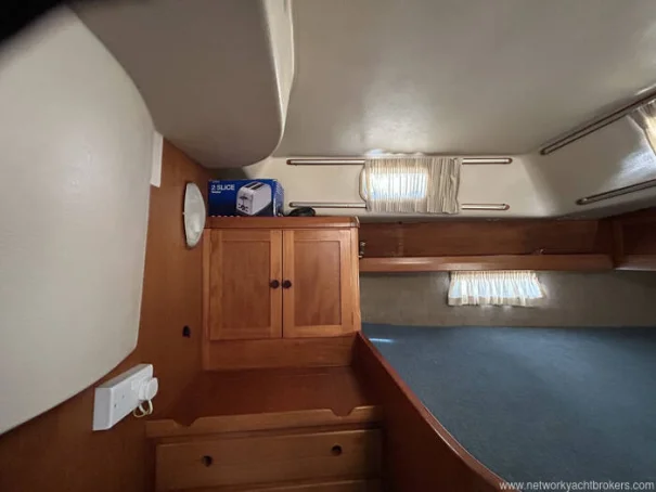 Aft of the saloon, access leads to the owner’s cabin located beneath the cockpit. This cabin features a generous double berth, hanging locker, and additional storage, offering a more private and quieter sleeping area, ideal for extended stays aboard. It also has its own Heads with a marine toilet and sink with hot and cold pressurised water.