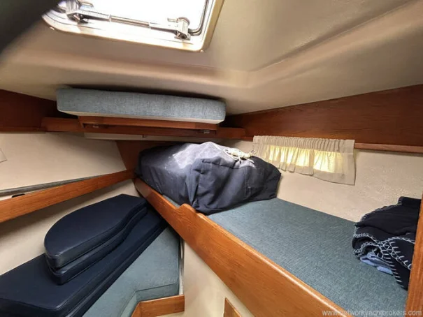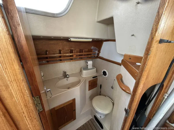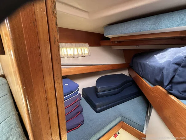 The forecabin provides comfortable accommodation with a V-berth arrangement, infill to create a double, and good stowage in lockers and beneath the berths. Natural light and ventilation are provided via an opening hatch and portlights. Adjacent is the heads compartment, fitted with a marine toilet, washbasin, and shower facilities.