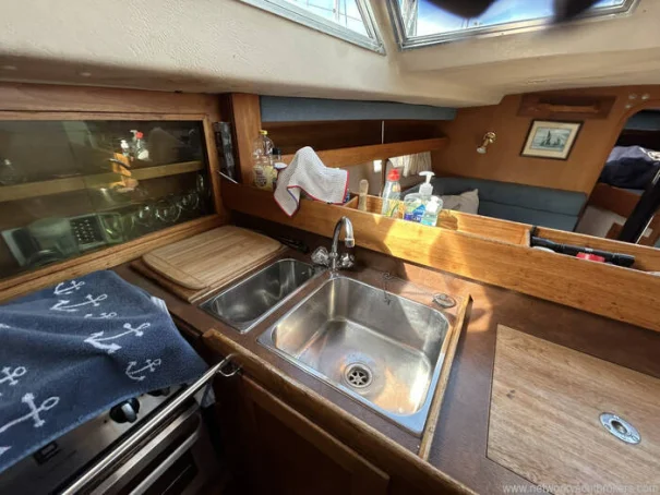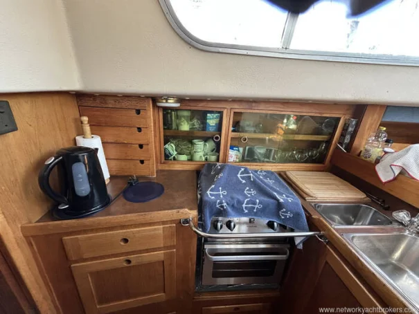 Forward of the saloon lies the galley, arranged in a practical, seagoing layout. It is well-equipped for cruising, offering a gimballed Voyager 4500 gas cooker with oven and grill, stainless steel sink, and Isotherm refrigerated storage, along with generous work surfaces and storage for provisions. Opposite the galley is the navigation station, providing a dedicated chart table and space for instruments, making passage planning and navigation convenient and sheltered.