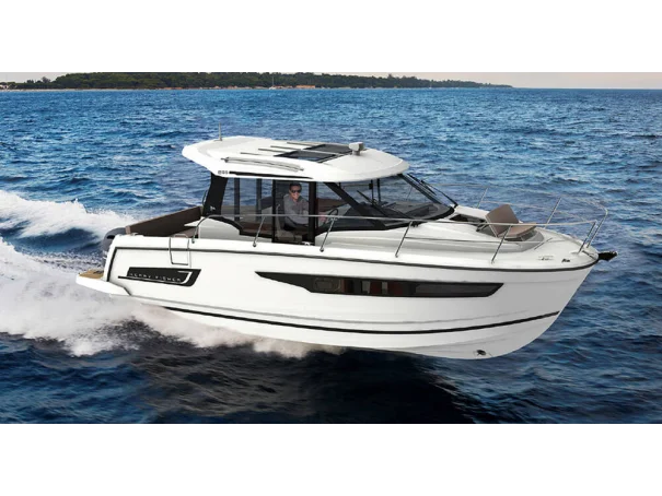Stepping aboard the Jeanneau Merry Fisher 895 Series 1, you enter the aft cockpit with bench seating, a table, and clear access along both side decks; inside, the saloon is bright with large windows, featuring a galley to port, a convertible dinette opposite, and a forward helm with good visibility; below deck, there’s a double master cabin in the bow with storage, a double guest cabin to starboard, with a shared heads compartment, giving a practical layout for long stays on board.